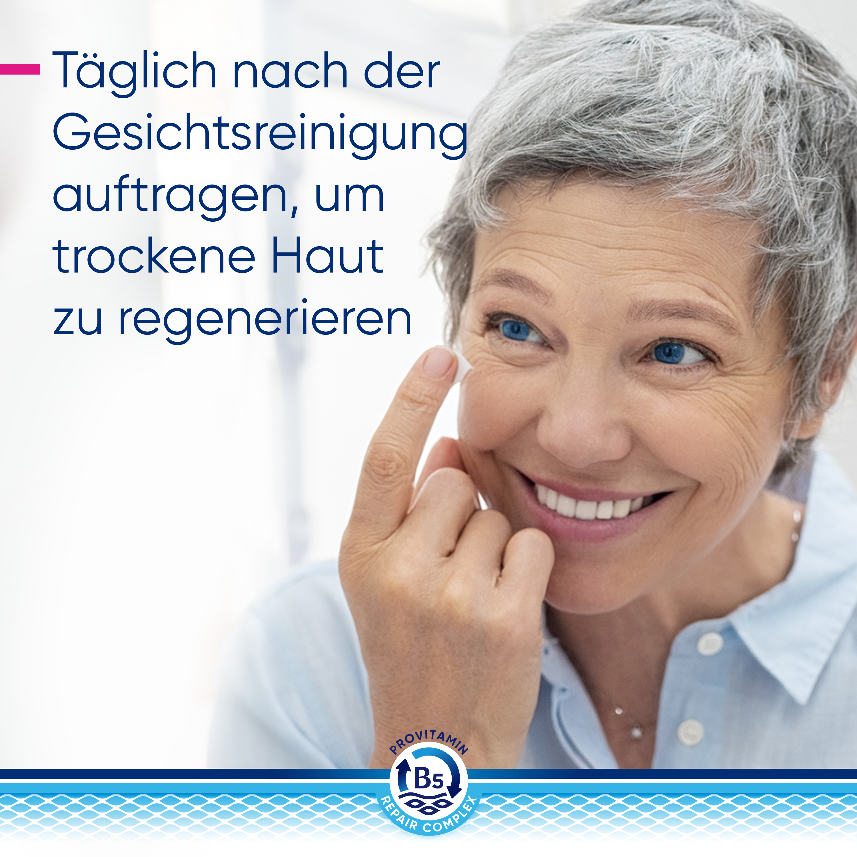 Der Provitamin B5 Repair Complex unterstützt die Regeneration der Haut – von innen nach aussen. Dabei fördert Dexpanthenol in tieferen Hautschichten der Epidermis die natürliche Zellregeneration. Das enthaltene Glycerin spendet sofortige und lang anhaltende Feuchtigkeit. Niacinamid (Vitamin B3) beruhigt juckende, trockene Haut und natürliche Lipide wie Sheabutter und Arganöl ergänzen fehlende Hautlipide. Das physiologische Lipid stellt die Barrierefunktionwieder der Haut her.