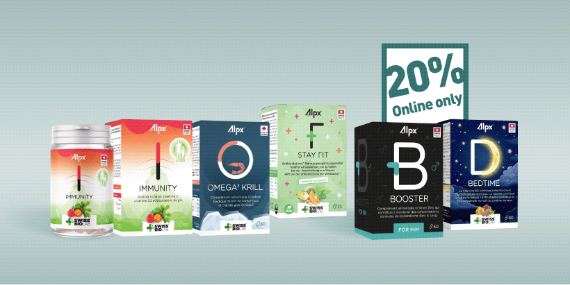 La force de la nature suisse concentrée dans des formules soigneusement élaborées : Alpx incarne des compléments alimentaires de la plus haute qualité. Que ce soit pour plus d’énergie, un soutien du système immunitaire ou un meilleur équilibre, ces produits vous accompagnent au quotidien. Cette semaine, profitez de 20% de rabais sur Alpx. Exclusivement dans la boutique en ligne Amavita.