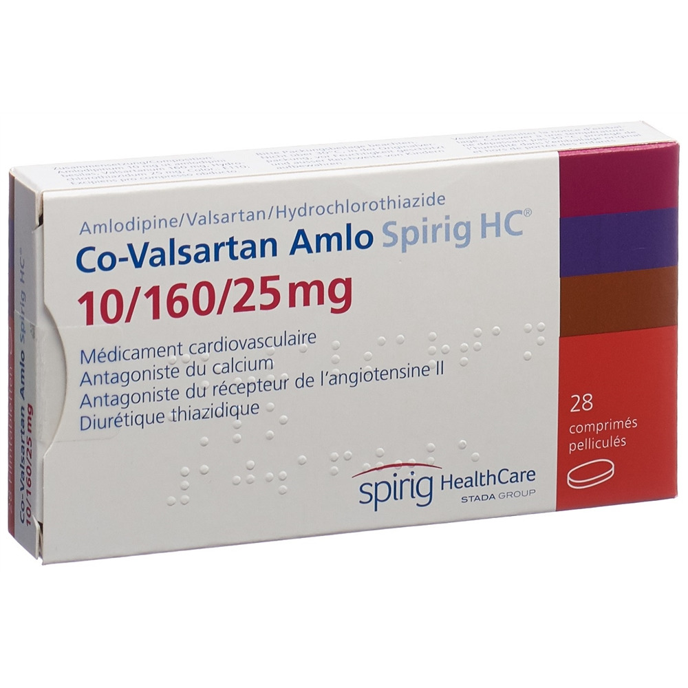 Co-Valsartan Amlo Spirig HC 10 mg/160 mg/25 mg compresse rivestite con film contiene i principi attivi amlodipina 10 mg (sotto forma di amlodipina besilato), valsartan 160 mg e idroclorotiazide 25 mg.