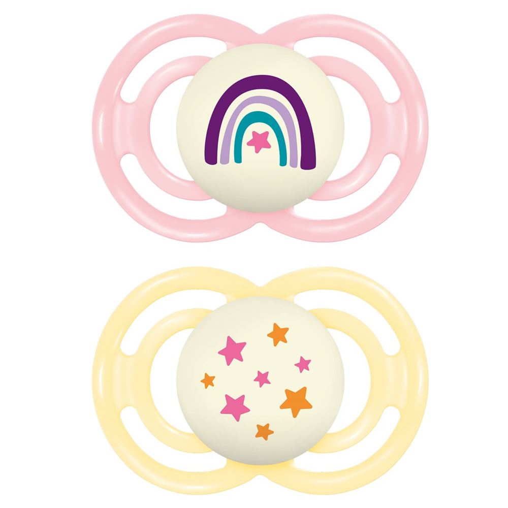 Il ciuccio MAM Night per bambini fino a 6 mesi offre un comfort extra grazie alla sua forma adatta alla mascella e alla morbida tettarella in silicone. Il set contiene due succhietti nei colori avorio e verde, con il pulsante del succhietto che si illumina al buio, in modo che il succhietto sia facile da trovare se viene sputato o perso durante la notte.